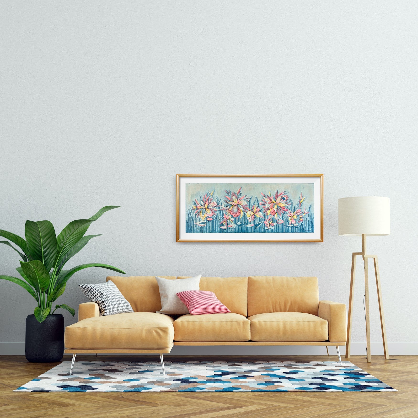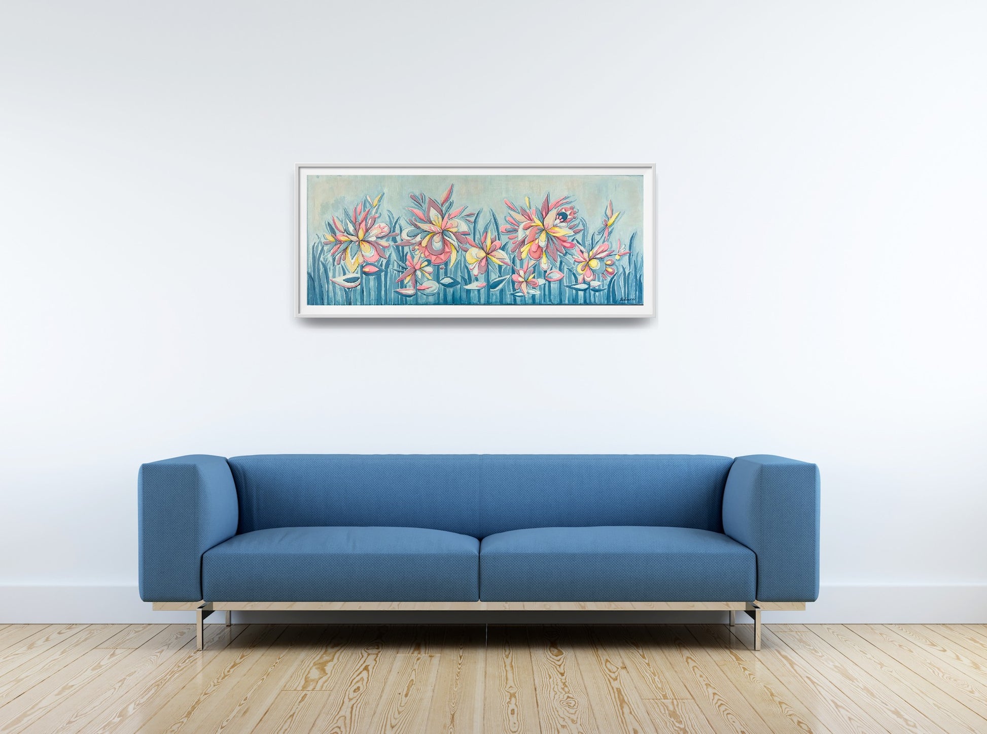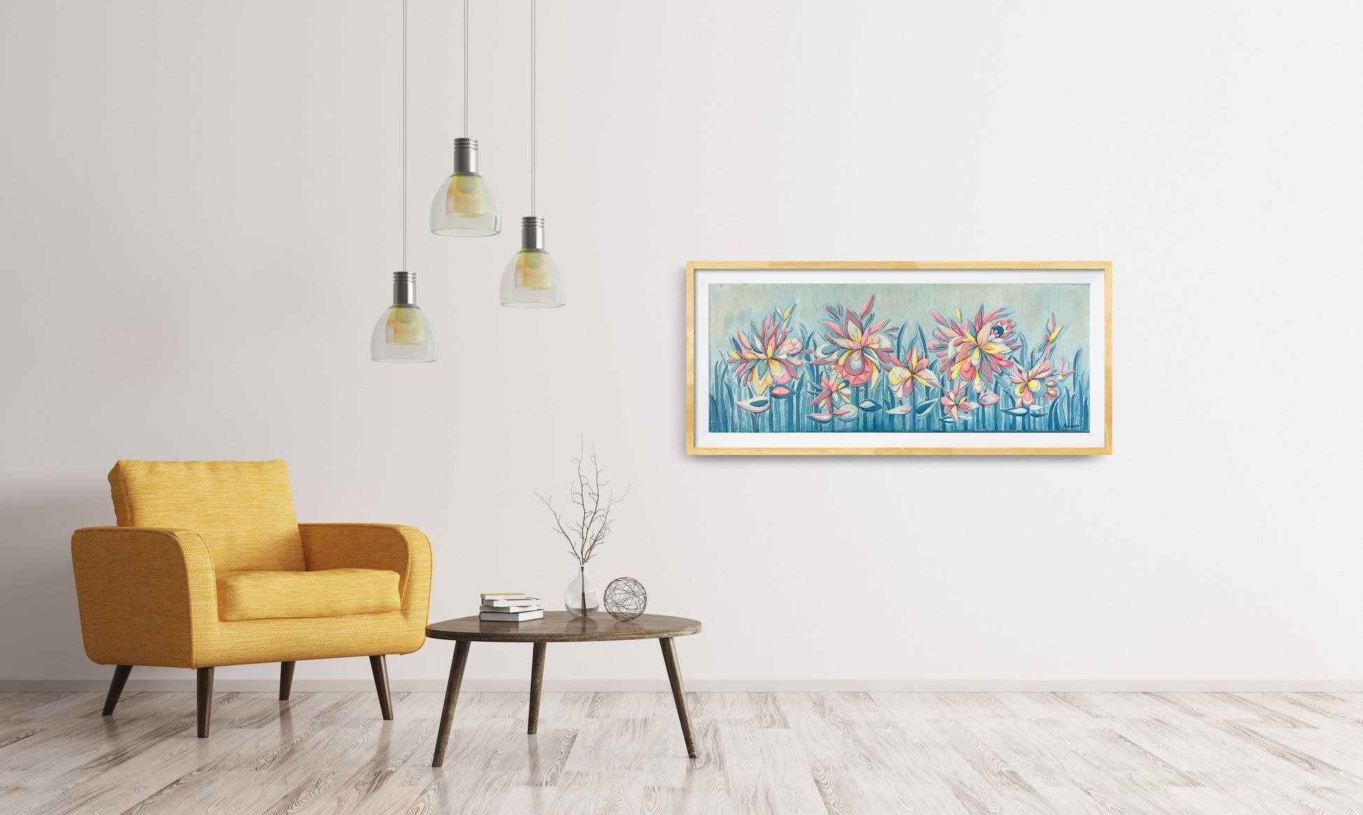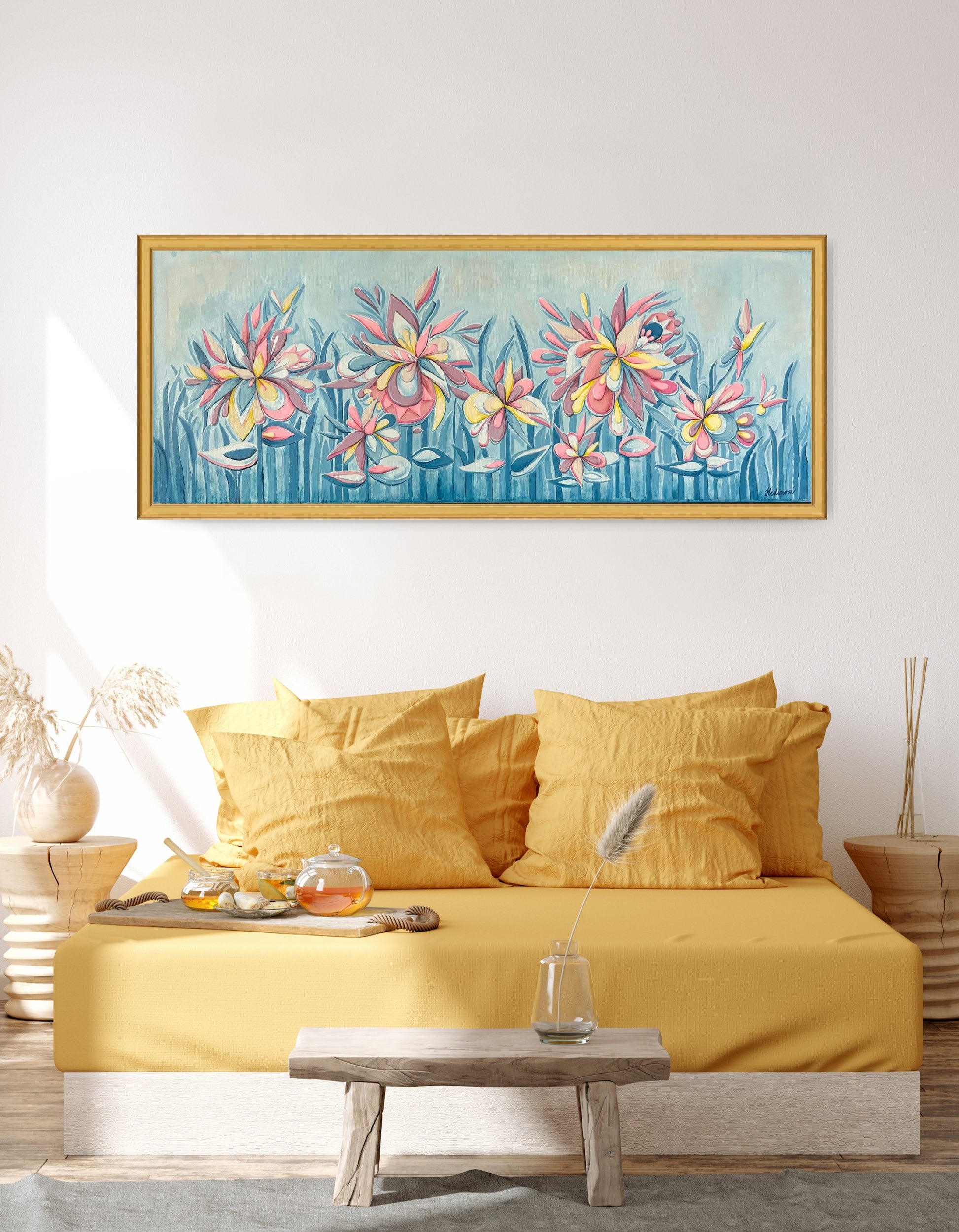 An original oil painting on canvas featuring a row of softly stylized flowers in delicate pastel colors. The gentle brushwork and balanced composition create a calm, airy atmosphere, making the piece ideal for modern, minimalist, or nature-inspired interiors.