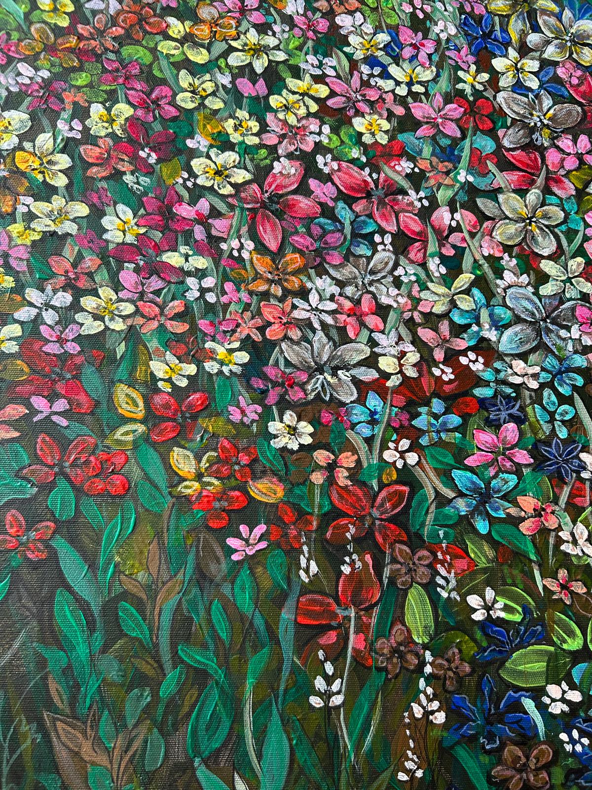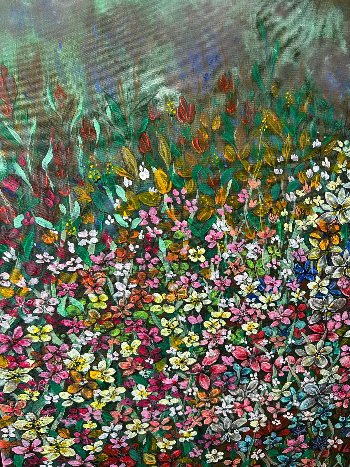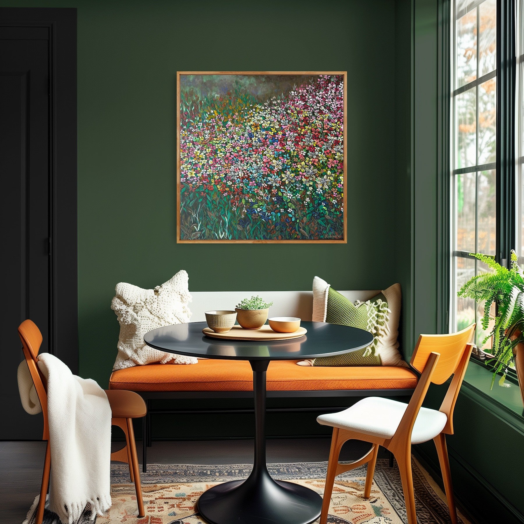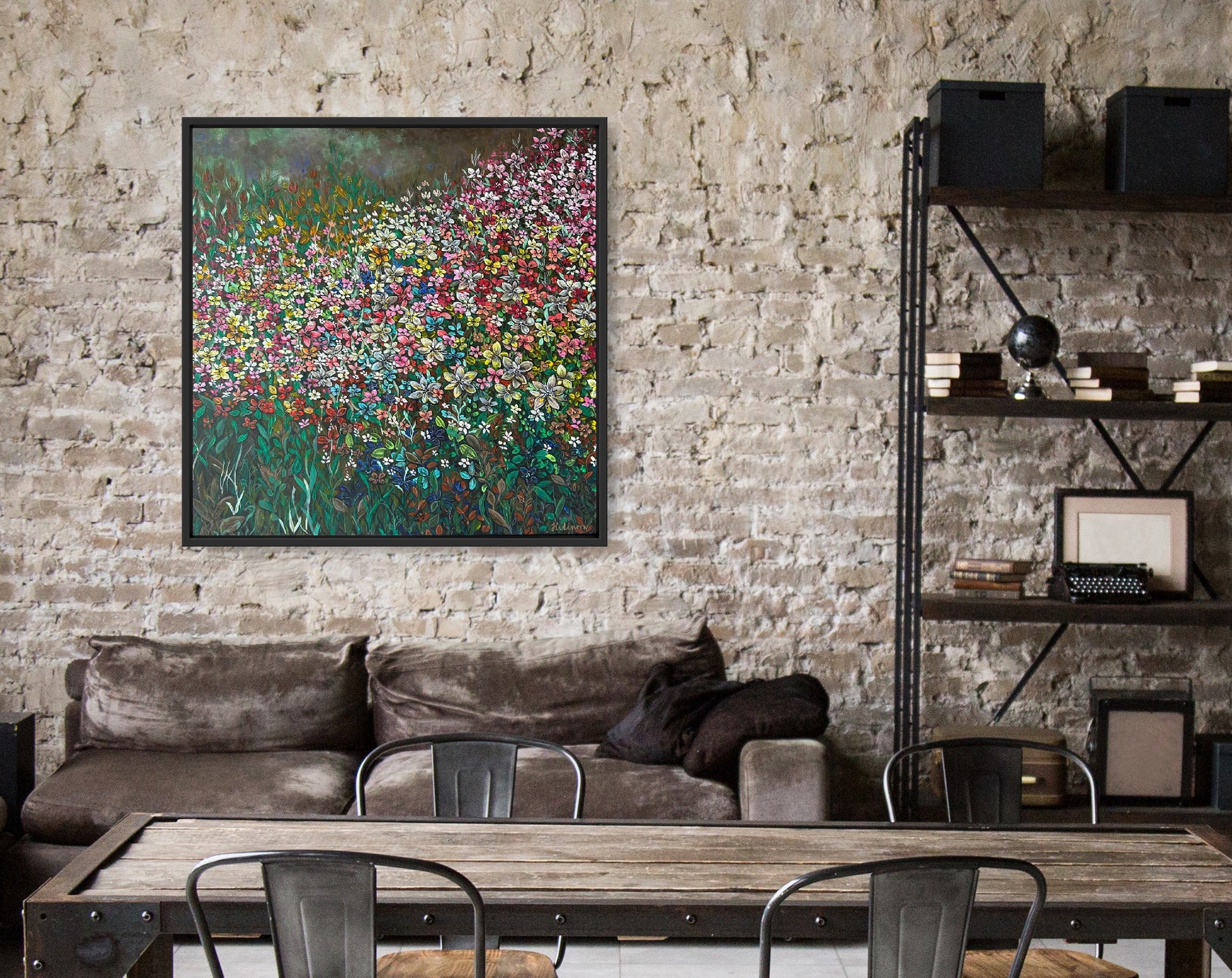An original 90 × 90 cm acrylic painting on canvas depicting a vibrant wildflower meadow in full bloom. Rich textures and expressive colors bring depth and vitality to the composition, while the balanced square format enhances its visual harmony.